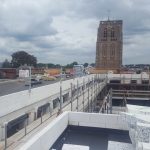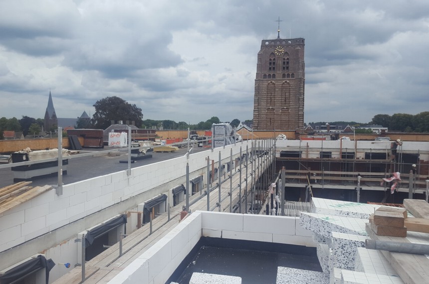 Het gevelmetselwerk is gereed en na het zakken van het gevelsteigerwerk wordt het mooie gebouw goed zichtbaar. Aan de daktuin wordt de laatste hand gelegd en de overige daken worden voorzien van dakpannen.