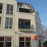Alle appartementen hebben toegang tot de prachtige daktuin. Op onderstaande foto proosten de heer en mevrouw Diekstra op hun nieuwe appartement. Wij wensen alle bewoners en winkeliers veel geluk in het Dommelsch Huys.