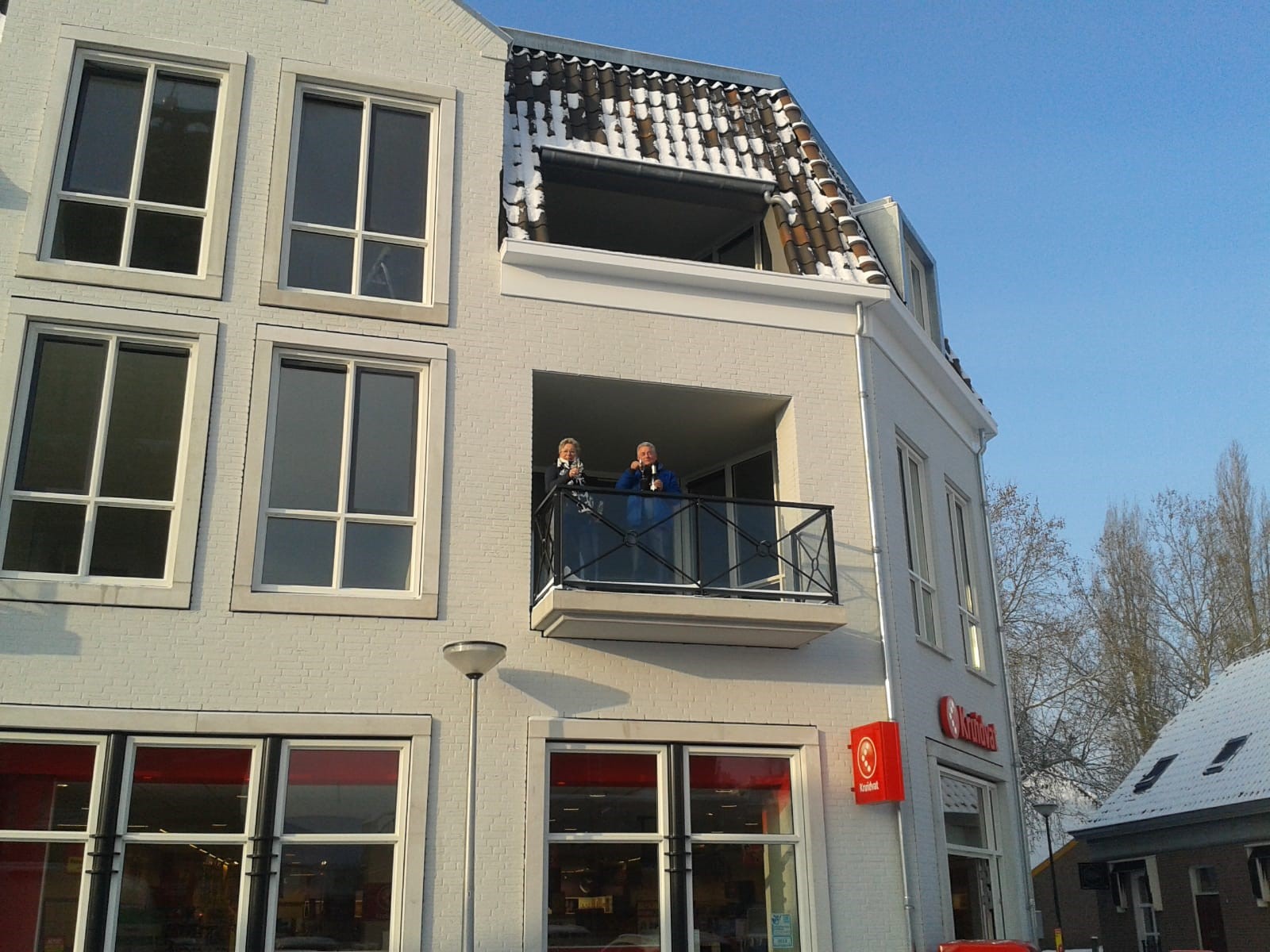 Alle appartementen hebben toegang tot de prachtige daktuin. Op onderstaande foto proosten de heer en mevrouw Diekstra op hun nieuwe appartement. Wij wensen alle bewoners en winkeliers veel geluk in het Dommelsch Huys.