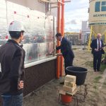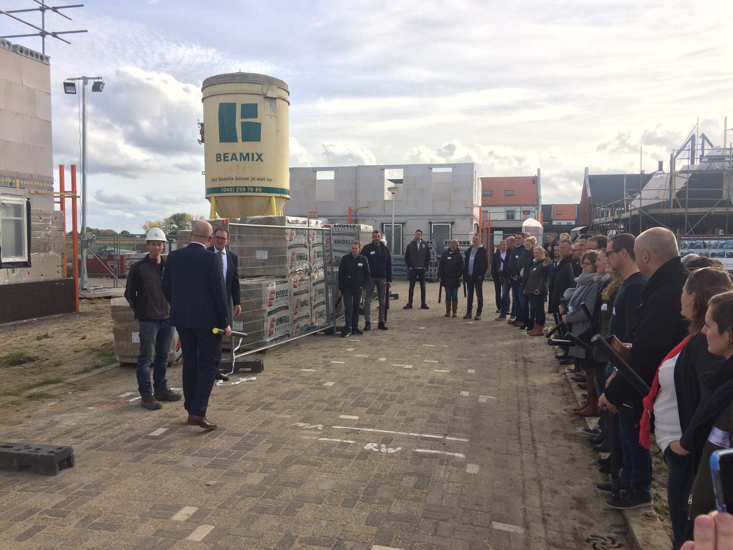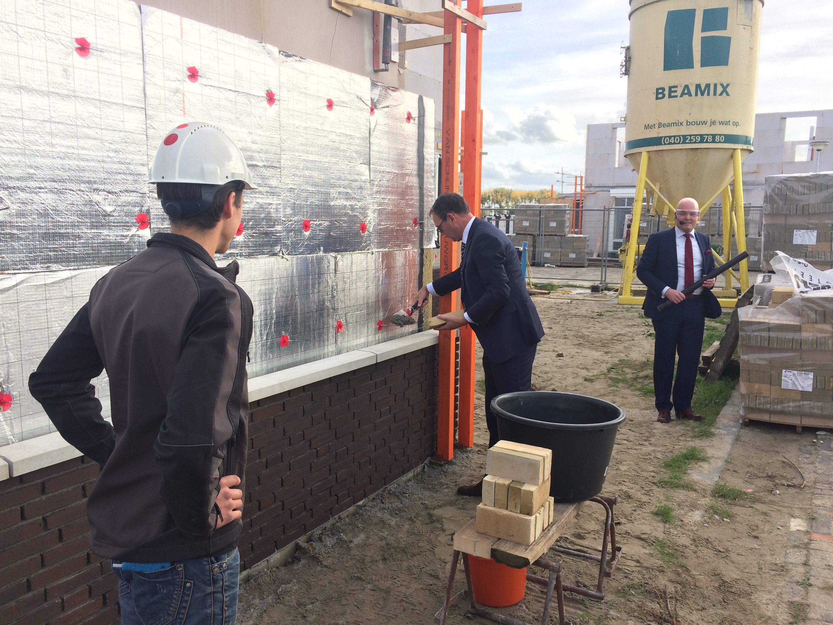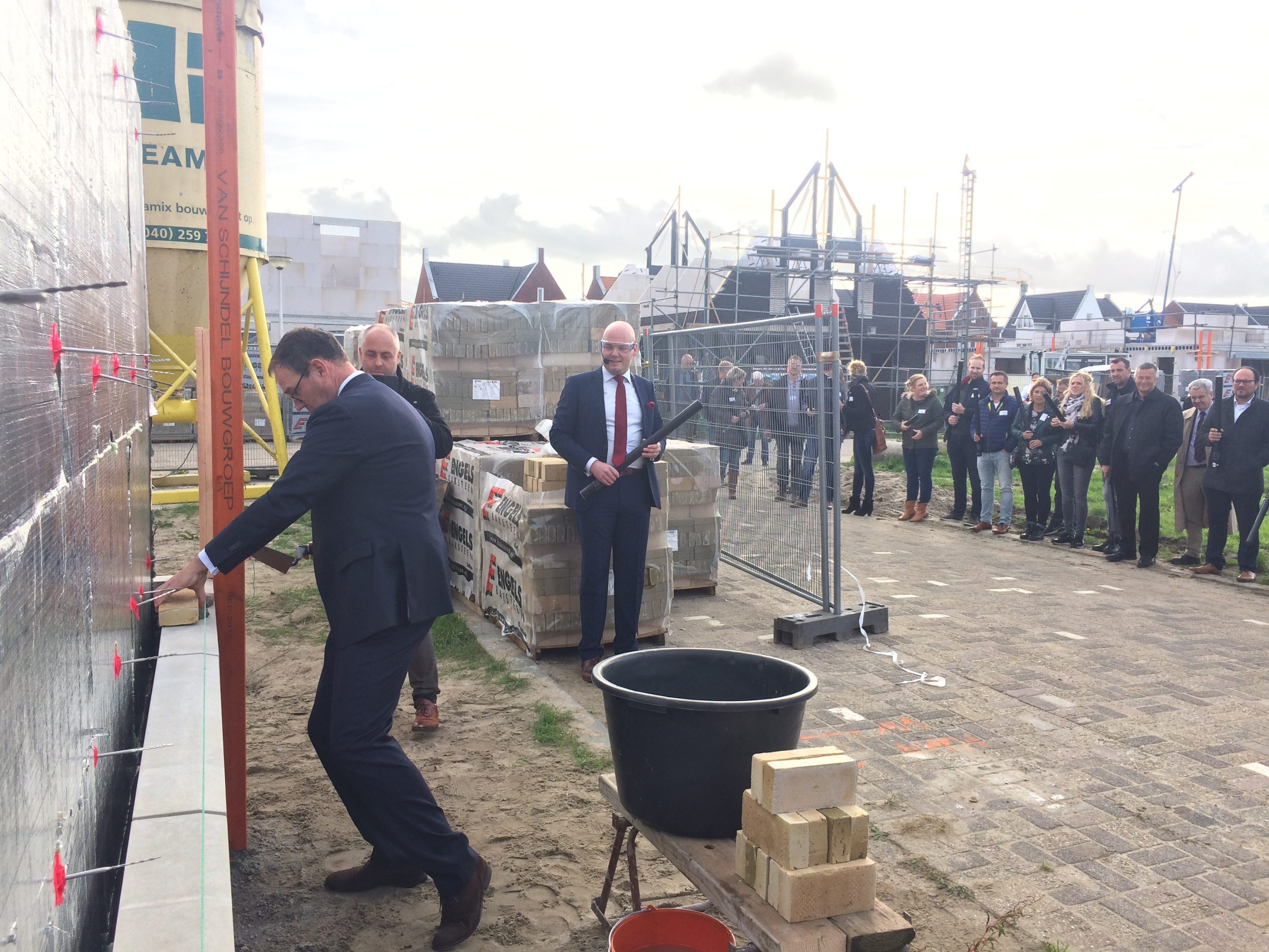 De toekomstige bewoners waren aanwezig om samen met het bouwteam en alle betrokkenen de bouw officieel te starten. De wethouder, de heer R. van Meygaarden, legt onder toeziend oog van de toekomsige bewoners de eerste steen.