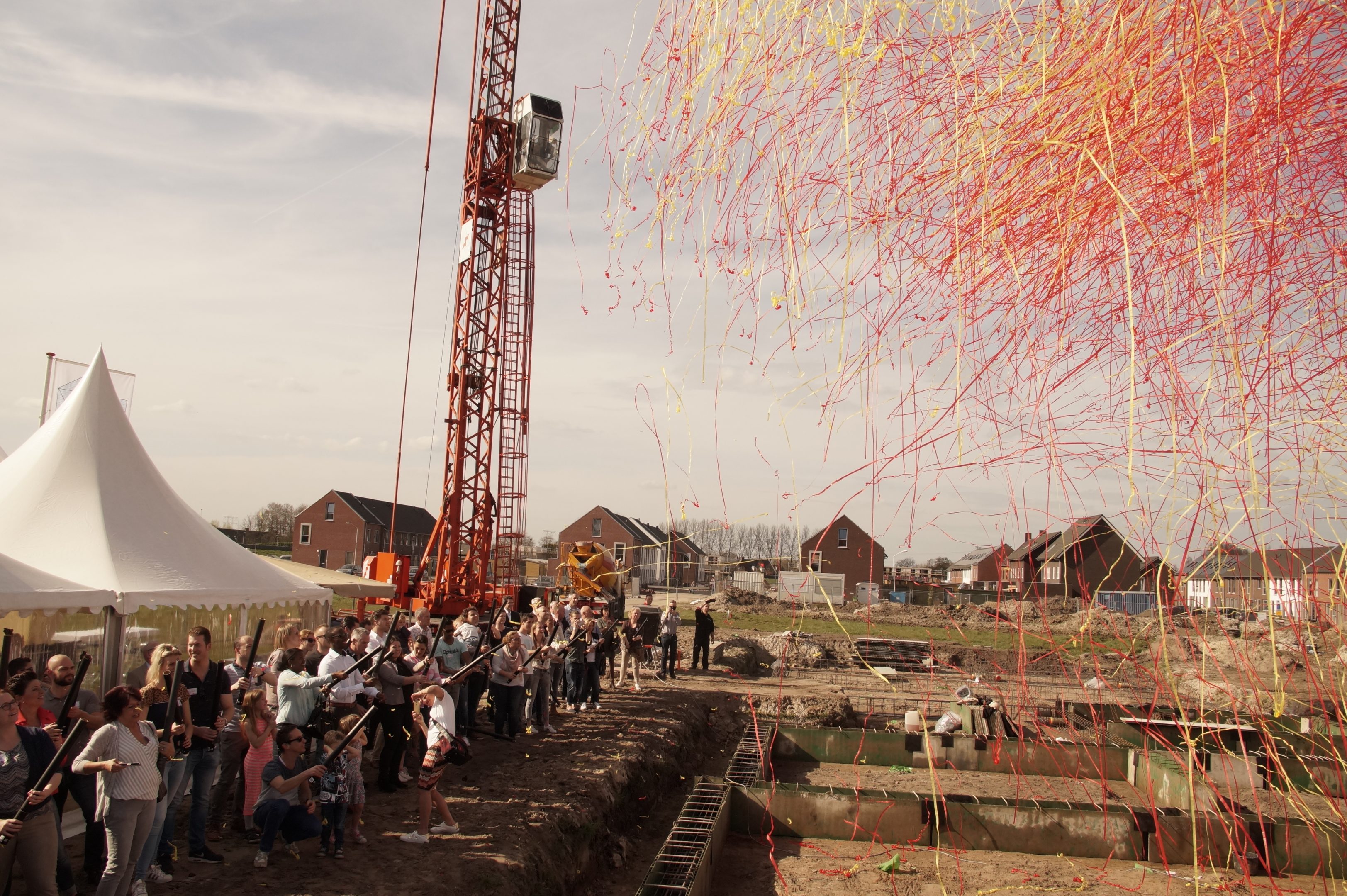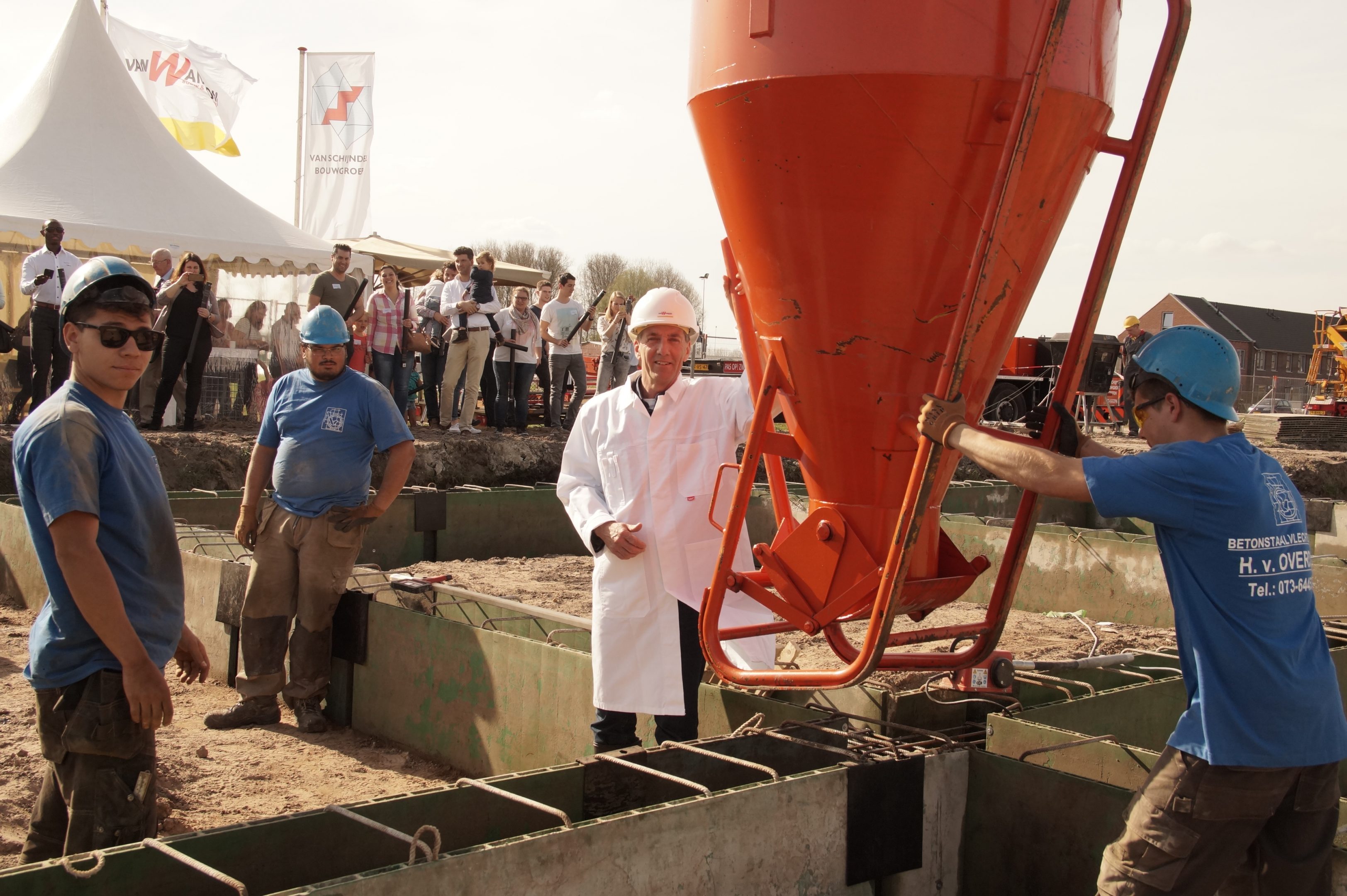 De wethouder, de heer Marc van Schuppen, stortte de eerste beton van de fundering op deze zonnige dag. De bewoners en overige bij het project betrokkenen waren aanwezig bij dit heugelijke moment.
