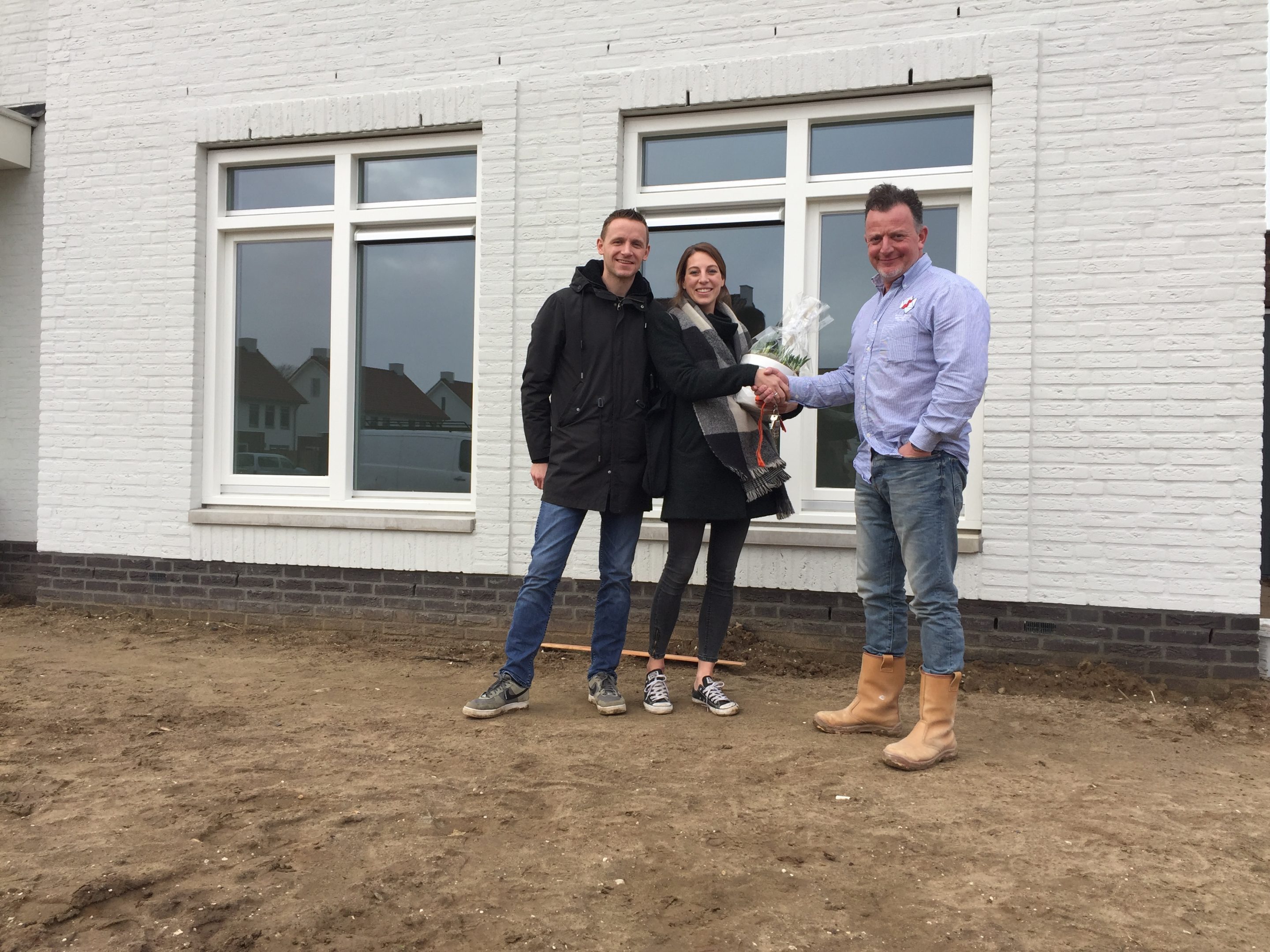 Op onderstaande foto overhandigd de uitvoerder, Gerrit Sterrenburg, de sleutel aan de heer Hendriks en mevrouw Tüss. Wij wensen iedereen heel veel woonplezier in hun nieuwe woning.