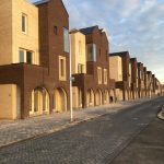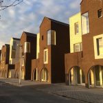 De woningen zijn gebouwd in smaakvolle donkere baksteen met witte accentren rondom de ramen en witte accenten die de hoeken en hoogte benadrukken.