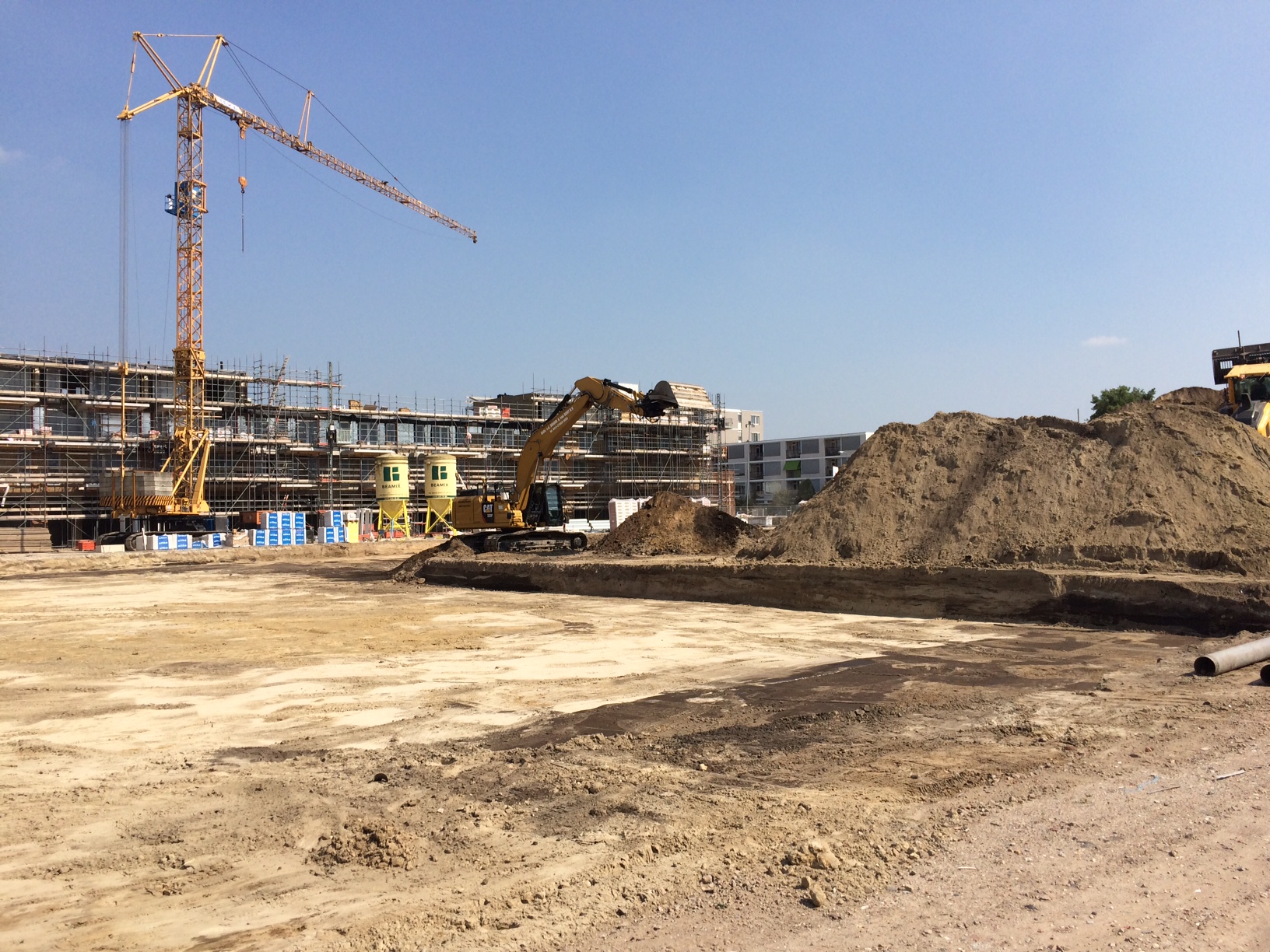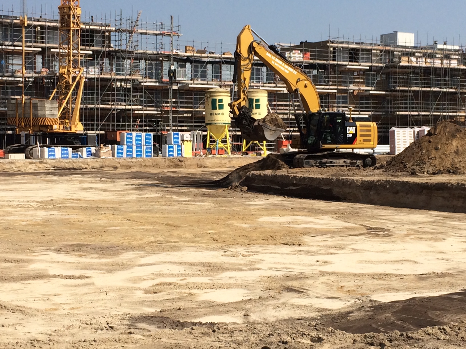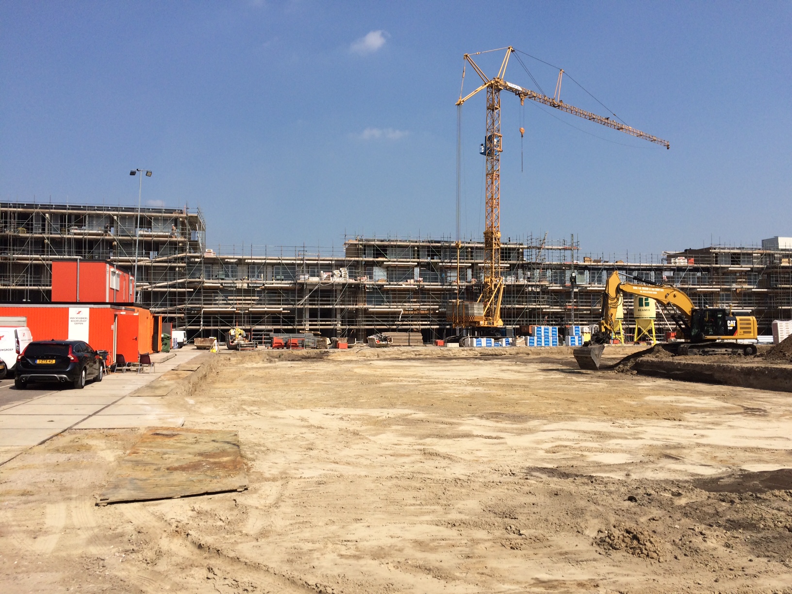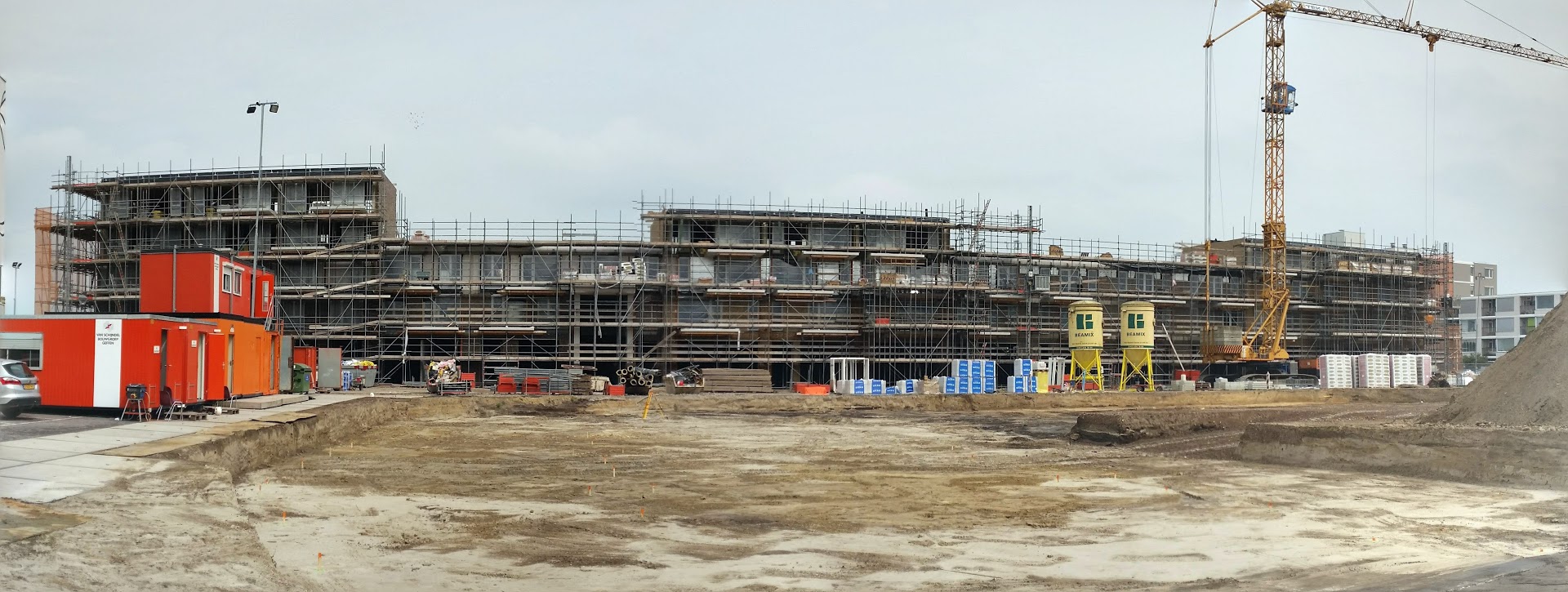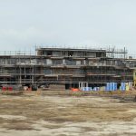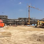De steiger is deels gedemonteerd waardoor de contouren van het gebouw en de gevels langzaam zichtbaar worden en waardoor het winkelcentrum steeds meer vorm zal krijgen.