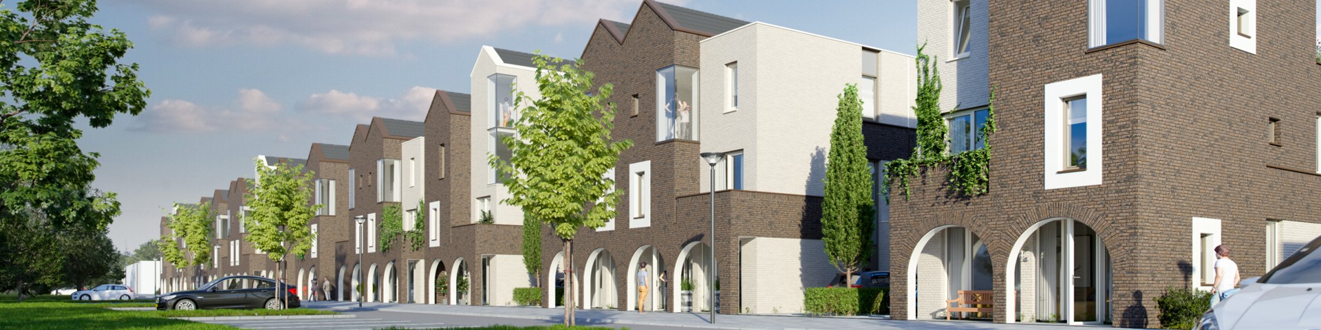 De woningen zijn gebouwd in smaakvolle donkere baksteen met witte accenten rondom de ramen en witte accenten die de hoeken en hoogte benadrukken.
