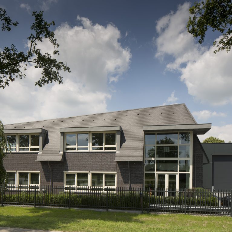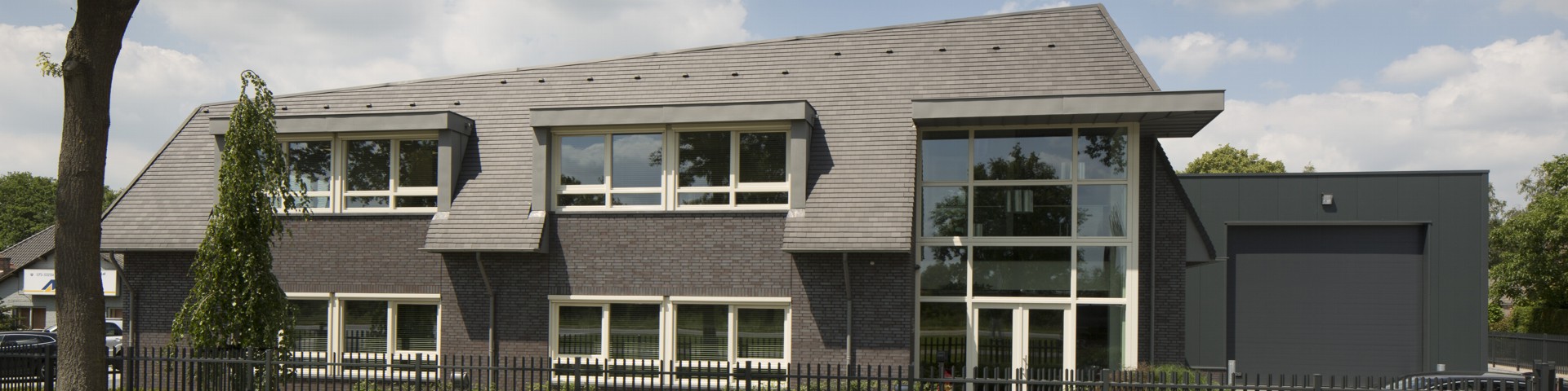 Bijzondere blikvanger aan dit project is de kapconstructie van het kantoorgedeelte. Het dak, dat in meerdere richtingen schuin loopt, werd voorzien van leipannen en een zinken randafwerking. De drie grote dakkapellen en de luifel boven de entree zijn eveneens met zink afgewerkt.